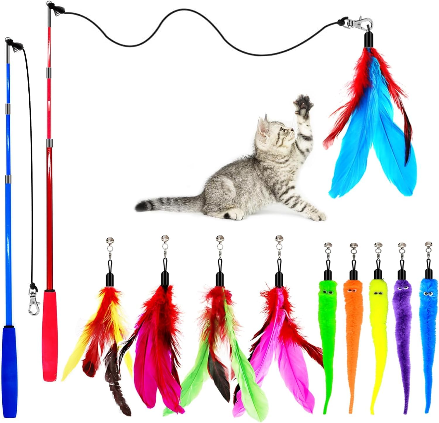 - مجموعة ألعاب القطط القيمة: ستحصل على إجمالي 12 قطعة من العناصر، بما في ذلك عبوتين من عصي القطط القابلة للسحب و10 عبوات إعادة تعبئة بديلة من الريش والديدان.