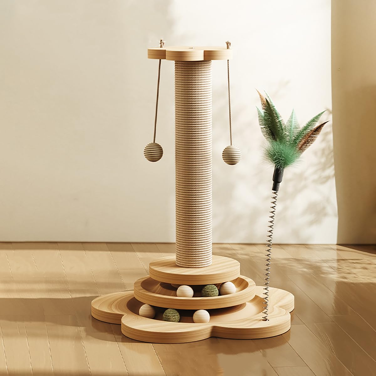 - 🐱【عمود خدش للقطط 4 في 1】 – يجمع عمود الخدش للقطط هذا بين بكرة لعبة القطط وعمود خدش للقطط ولعبة ريش وكرات متدلية. يعد خيارًا ممتازًا لاكتشاف تفضيلات القطط والهريرات. وفي الوقت نفسه، يساعدك على توفير المساحة.