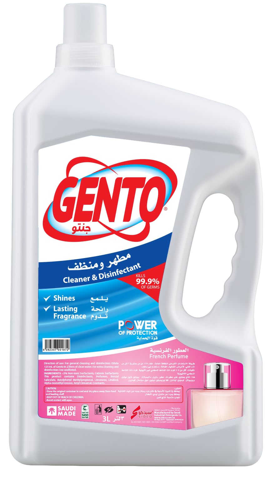 • منظف جينتو هو مزيج من مركبات الأمونيوم الرباعية عالية الجودة وصابون المنظفات لاستخدامه كمنظف عام ومطهر ومزيل للرائحة ومبيد للفطريات ومبيد للجراثيم