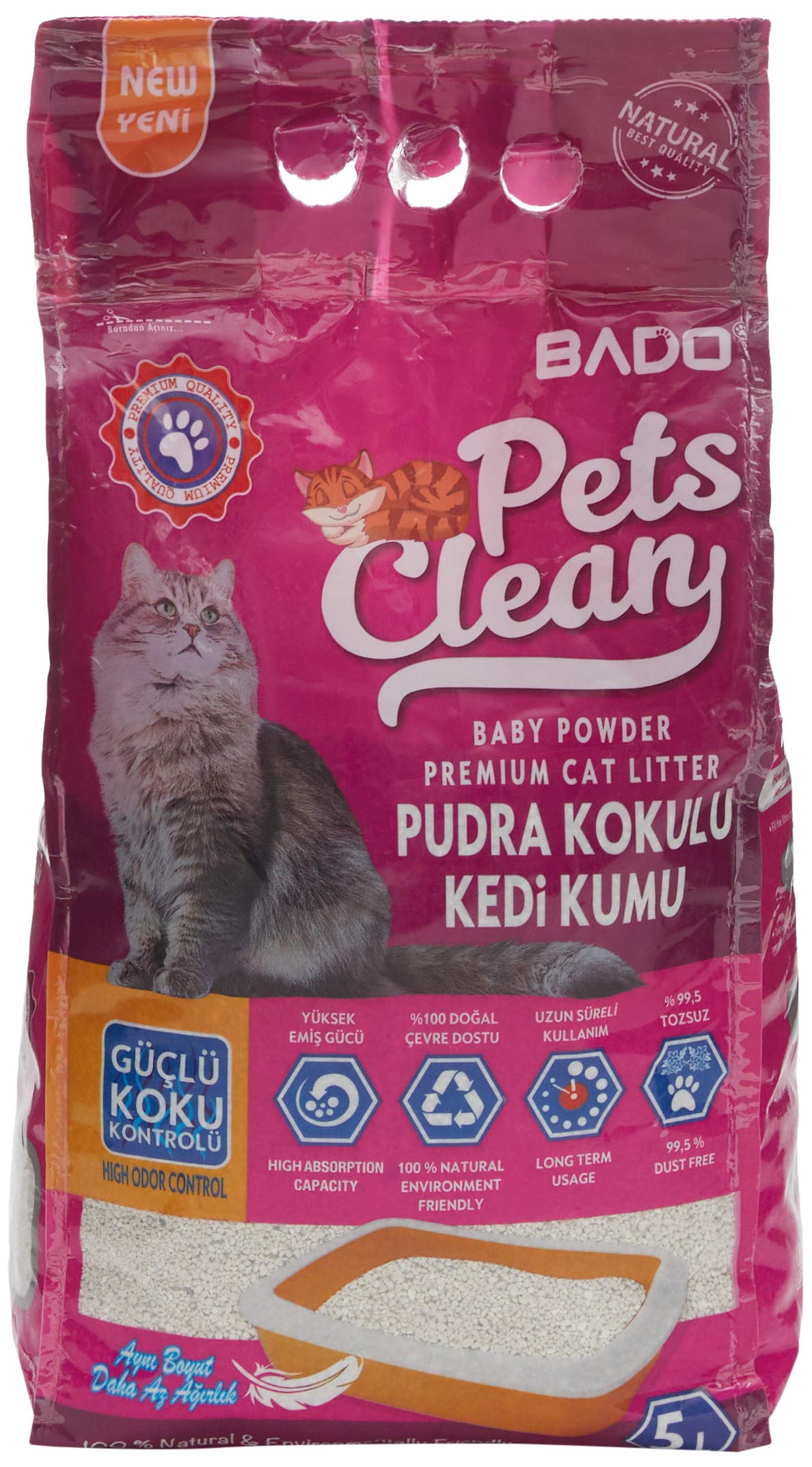 فرش بودرة القطط من بادو مصنوعة من رمل البنتونيت الطبيعي ولا تحتوي على مواد ضارة يمكن أن تضر بصحة قطتك. تتميز التركيبات الجزيئية للمعادن الطبيعية المستخدمة في موادها الخام بقوة امتصاص عالية للسوائل. يتكتل على الفور وبالتالي يمتص السائل في وقت قصير جدًا. يتميز بخاصية التكتل المثالية، ويشكل كتلًا سريعة وثابتة. بفضل خاصية التكتل السريع، يمنع تجمع السوائل والروائح تحت فضلات القطط، ويوفر بيئة صحية ونظيفة لقطتك من خلال توفير جفاف مثالي حتى في الاستخدام طويل الأمد. تتم إزالة التكتلات المتكونة بالمجرفة على الفور وبالتالي تمنع نمو البكتيريا. يأتي بوزن 5 كغم.