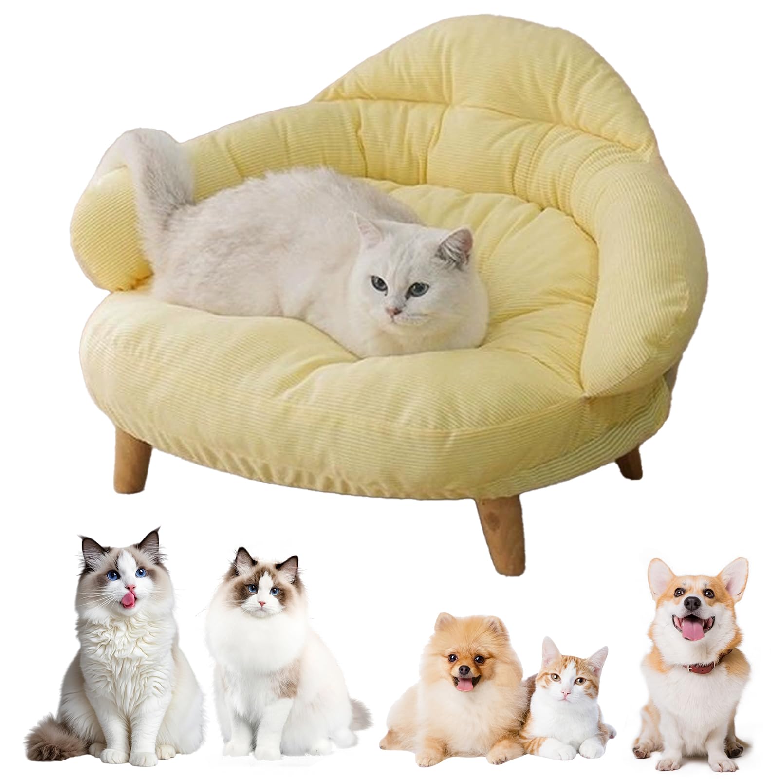 سرير كنبة قطط، سرير كنبة قطط، سرير كنبة قطط، أريكة للحيوانات الأليفة للقطط الداخلية، سرير خشبي مرتفع للقطط مع غطاء مرتبة قابل للإزالة، مناسب للقطط الصغيرة (اصفر ليموني)