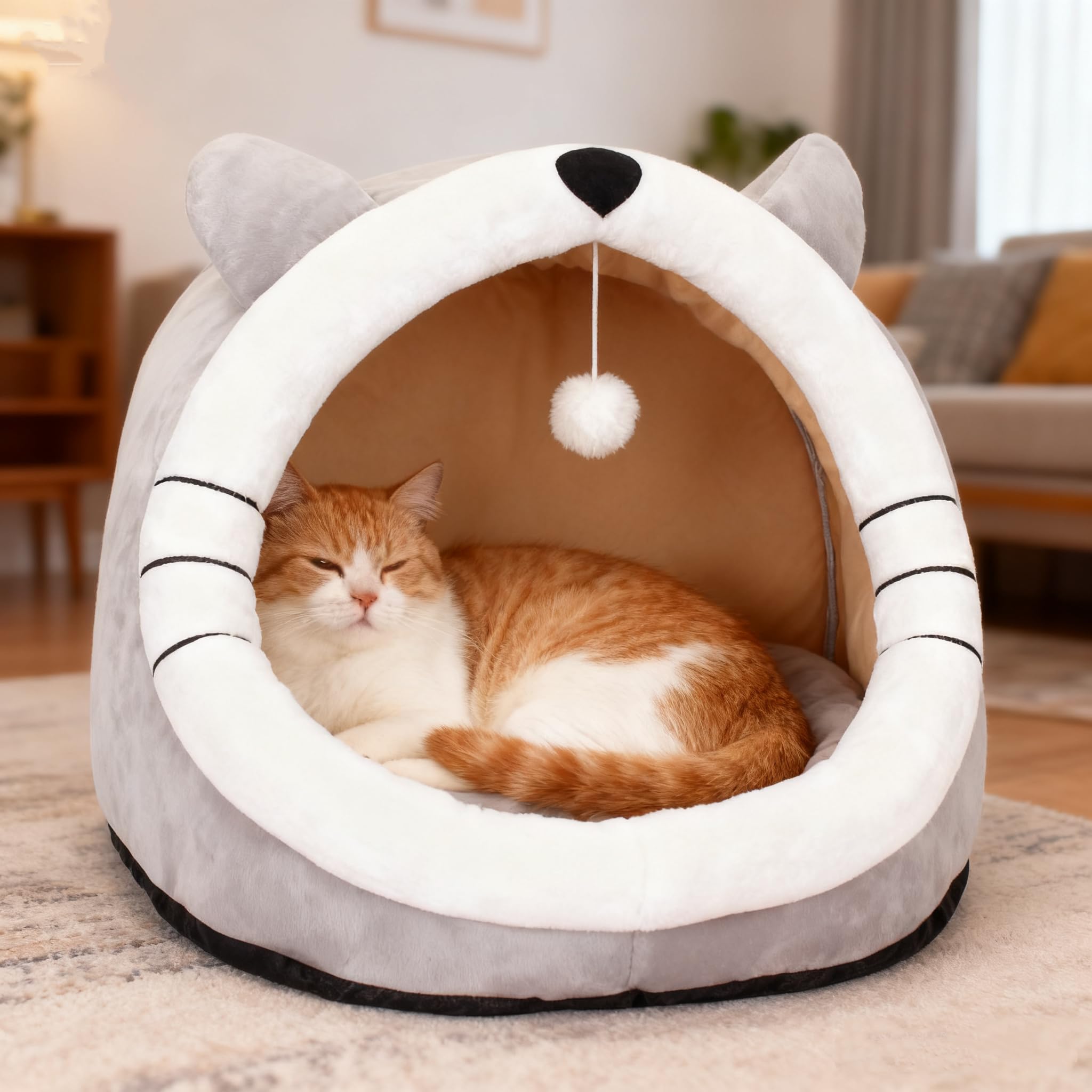 - 【تصميم مرح】يتميز بمدخل مريح على شكل كهف مع آذان قطة رمادية رائعة وكرة بوم بيضاء معلقة. مثالية للقطط/الكلاب الصغيرة التي تبحث عن الأمان، بينما تثير كرات بوم بوم متعة الضرب والانقضاض.