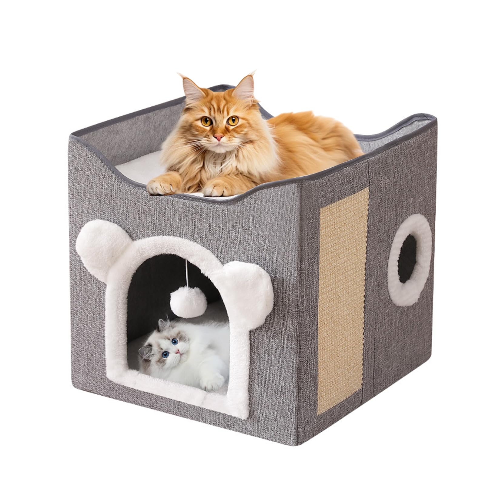 3. الغفوة والاختباء: سيشعر حيوانك الأليف المشاكس وكأنه ملك الجبل فوق منزل القطط، بينما يشعر حيوانك الأليف الخجول بالدفء والأمان من الداخل وهو ينظر للخارج.