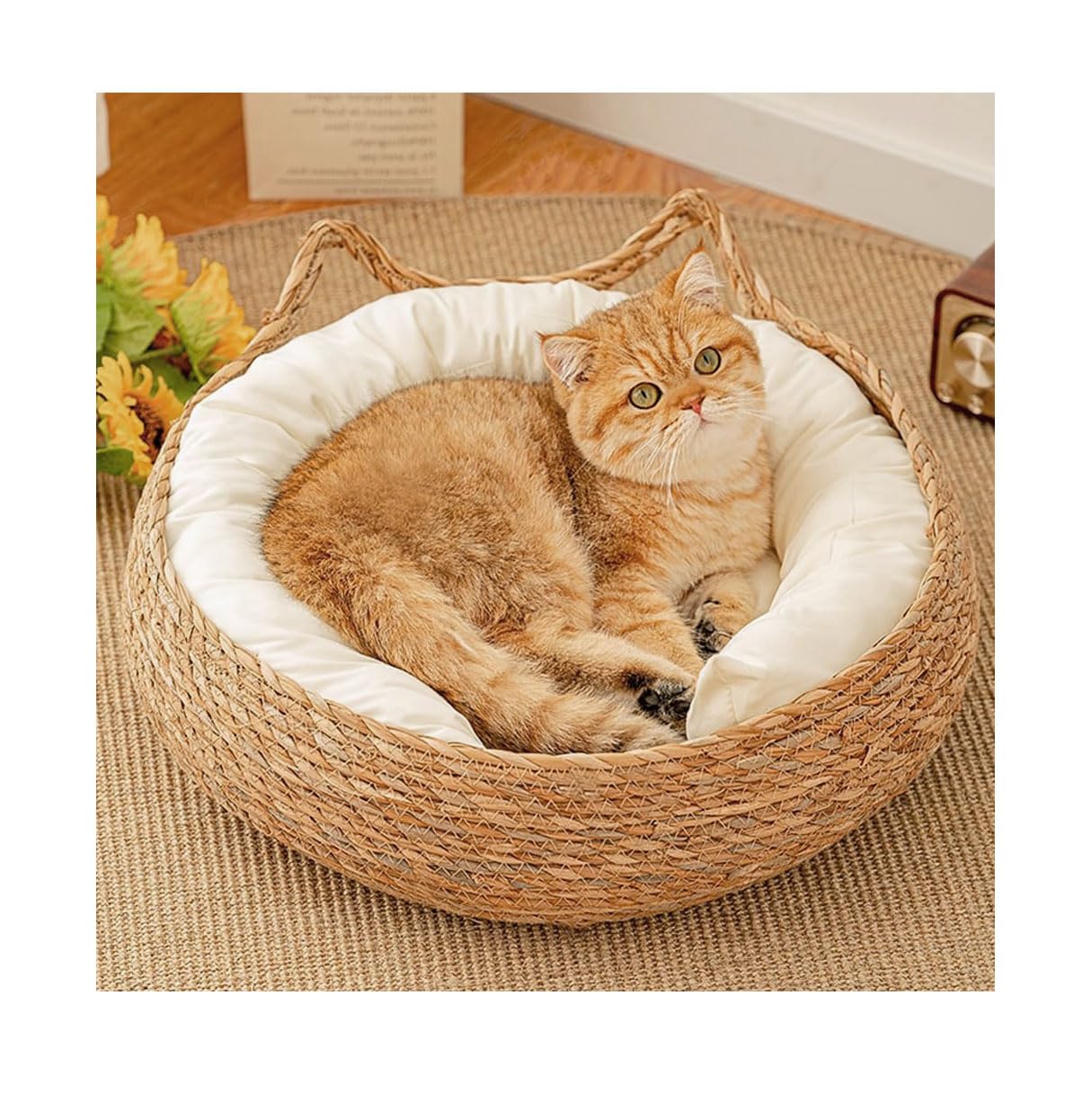 1 × سرير قطط دائري مصنوع يدويًا من الراتان
