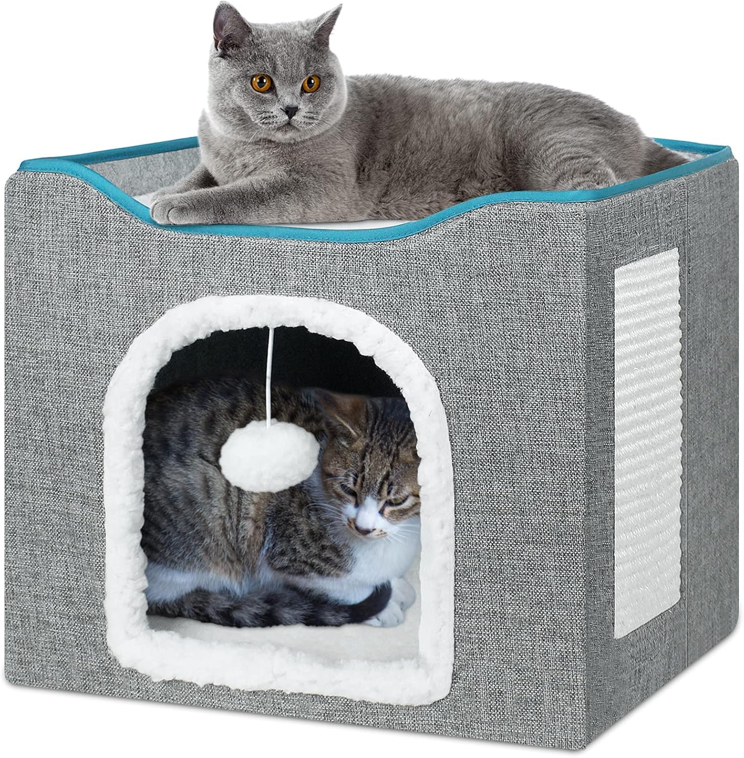 - 【مساحة كبيرة وكرة مضحكة】يسمح مكعب القطط هذا للقطط بالنوم بشكل مجعد. فتحة كبيرة الحجم 21.5 سم لتخزين القطط بأحجام مختلفة بسهولة ويمكنها الدخول والخروج دون صعوبة. تضيف الكرة المخملية المعلقة إلى متعة القطة..