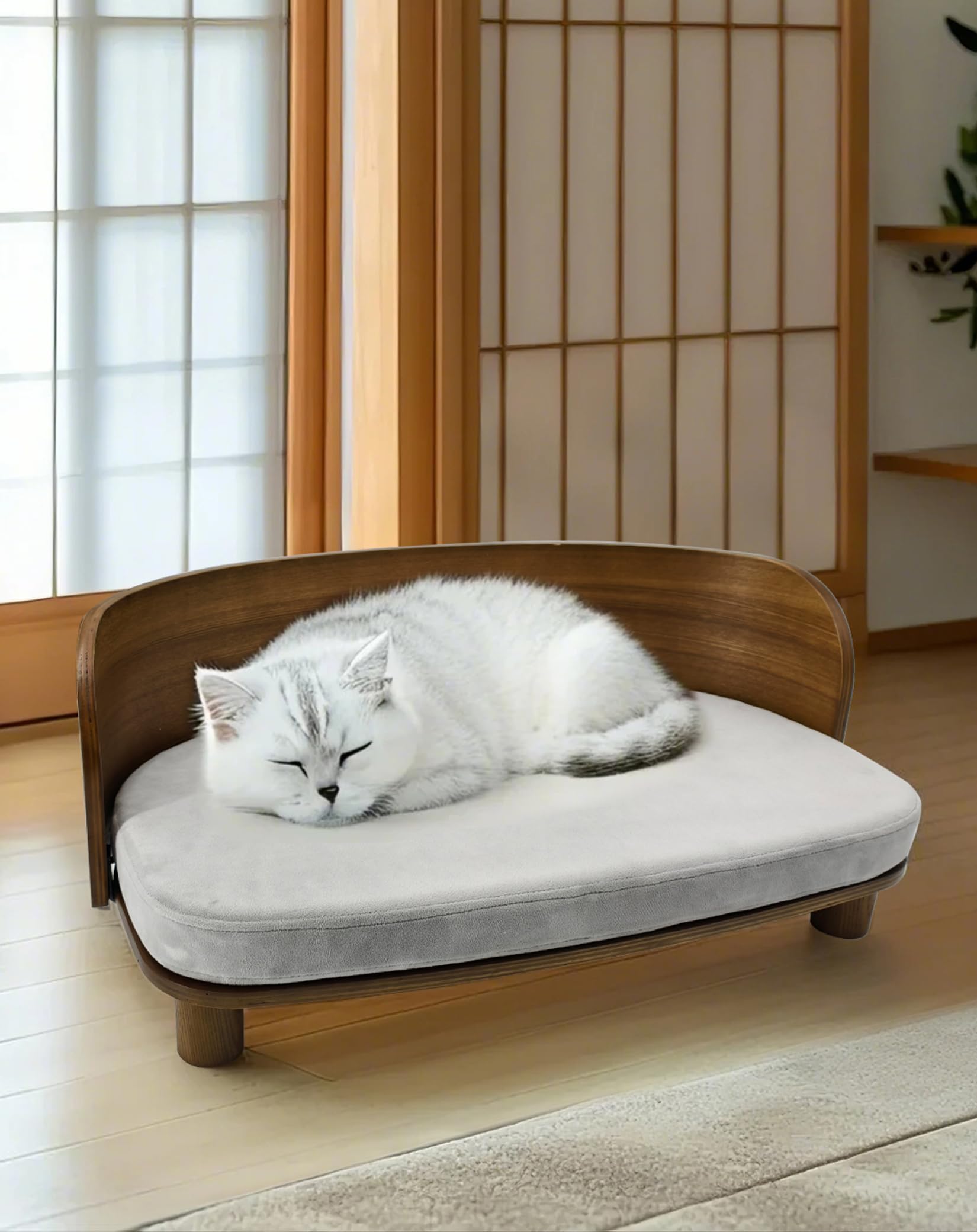• أثاث أنيق للحيوانات الأليفة: يمتزج سرير الحيوانات الأليفة العصري هذا بسلاسة مع ديكور المنزل، حيث يتميز بوسادة أنيقة ذات لون رمادي وإطار من الخشب الطبيعي، مما يجعله إضافة أنيقة وعملية.