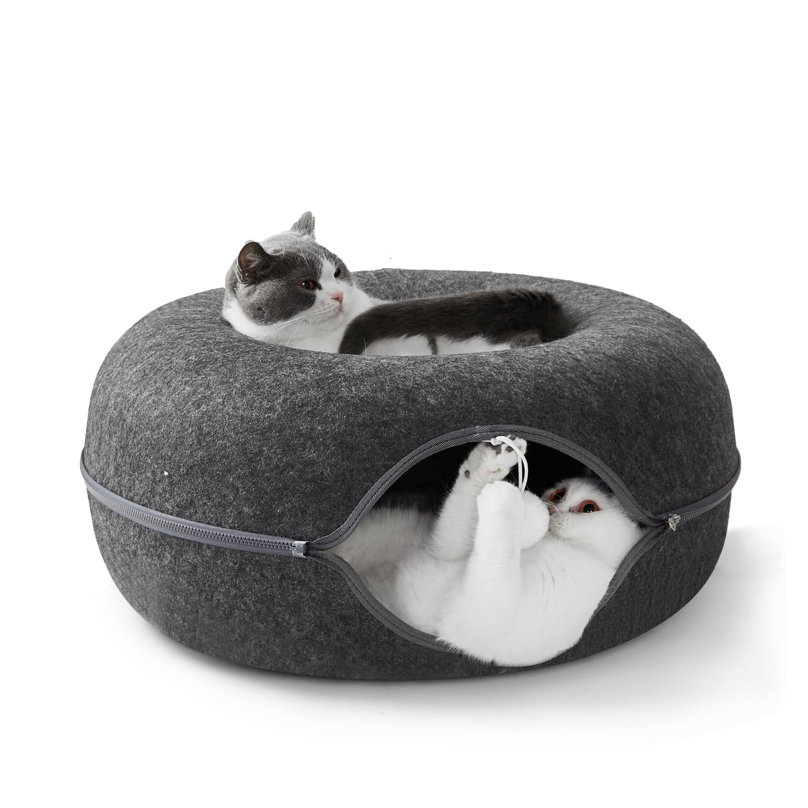 • خامة اللباد المختارة: سرير بتصميم نفق للقطط مصنوع من مادة اللباد المختارة، وهي مقاومة للاهتراء والخدش ولن يُُكوُِن كرات منفوشة لتلبية طبيعة الخدش والاحتكاك اليومية للقطط. سرير للقطط يمكن استخدامه في جميع الفصول