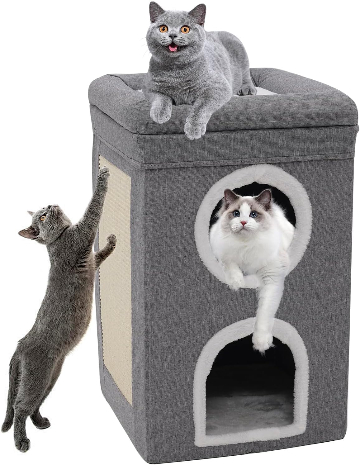 • تصميم من 3 طبقات: يمكن استخدام ثلاث قطط في وقت واحد، مع توفر المنطقتين السفليتين مساحة نوم مخفية ومظلمة للقطط، بينما يمكن استخدام المنصة العلوية للتغاضي عن البيئة الخارجية والنظر إلى المسافة، مما يجعلها خيارًا مثاليًا لعائلات القطط المتعددة.