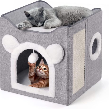 بيت قطط متعدد الوظائف من بيجثري، سرير للقطط الداخلية، عش قطط، كهف مكعب للقطط قابل للطي، بيت لعب كبير للحيوانات الاليفة مع كرة منفوشة، سرير قطط مغطى للقطط الصغيرة متعددة (رمادي)
