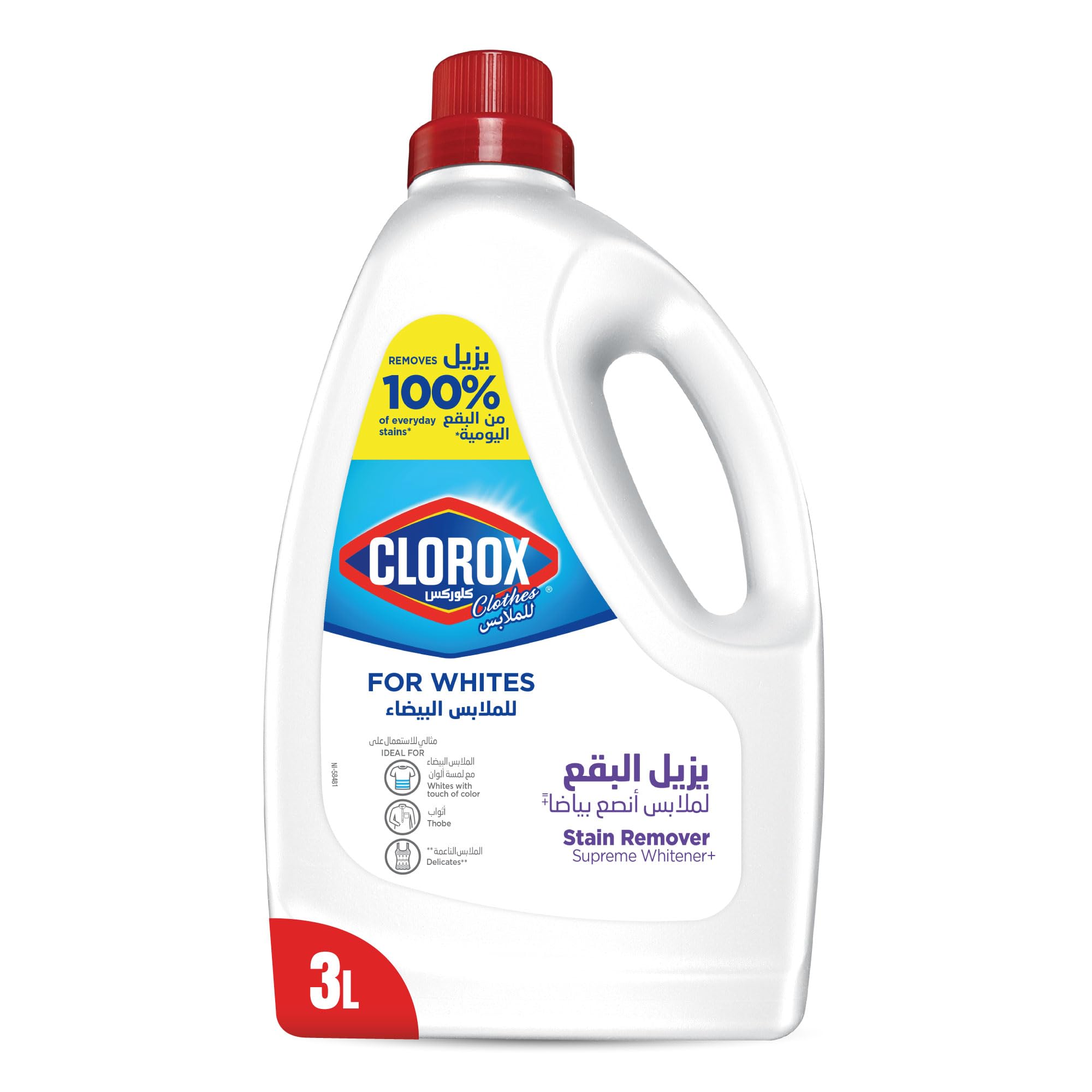تأكدي دائمًا من التحقق من ملصق العناية بالقماش وتعليمات الغسيل. استخدمي كلوركس للملابس البيضاء مع منظفك لإزالة البقع الدهنية وكذلك القهوة والشاي والكاتشب وعصير الفاكهة. يزيل 100% من البقع اليومية (تم اختباره على البقع الحديثة مثل: صلصة الطماطم والخردل والحبر، وعصائر الفاكهة والقهوة والشاي. انقعيها مسبقًا للحصول على نتائج أفضل). كما أنه آمن على الأقمشة الحساسة القابلة للغسل مثل الحرير والصوف والموهير. يوفر كلوركس للملابس البيضاء عناية فائقة لملابسك، للحصول عاى أنصع بياض. إنه يعزز فعالية المنظف ويزيل أصعب البقع مما يجعل ملابسك تبدو نظيفة ومشرقة بشكل لا تشوبه شائبة. للحصول على تعليمات الاستخدام قبل الغسيل وأثناء الغسيل والنقع وللبقع الصعبة، يرجى الرجوع إلى تعليمات الاستخدام الموجودة على الملصق.